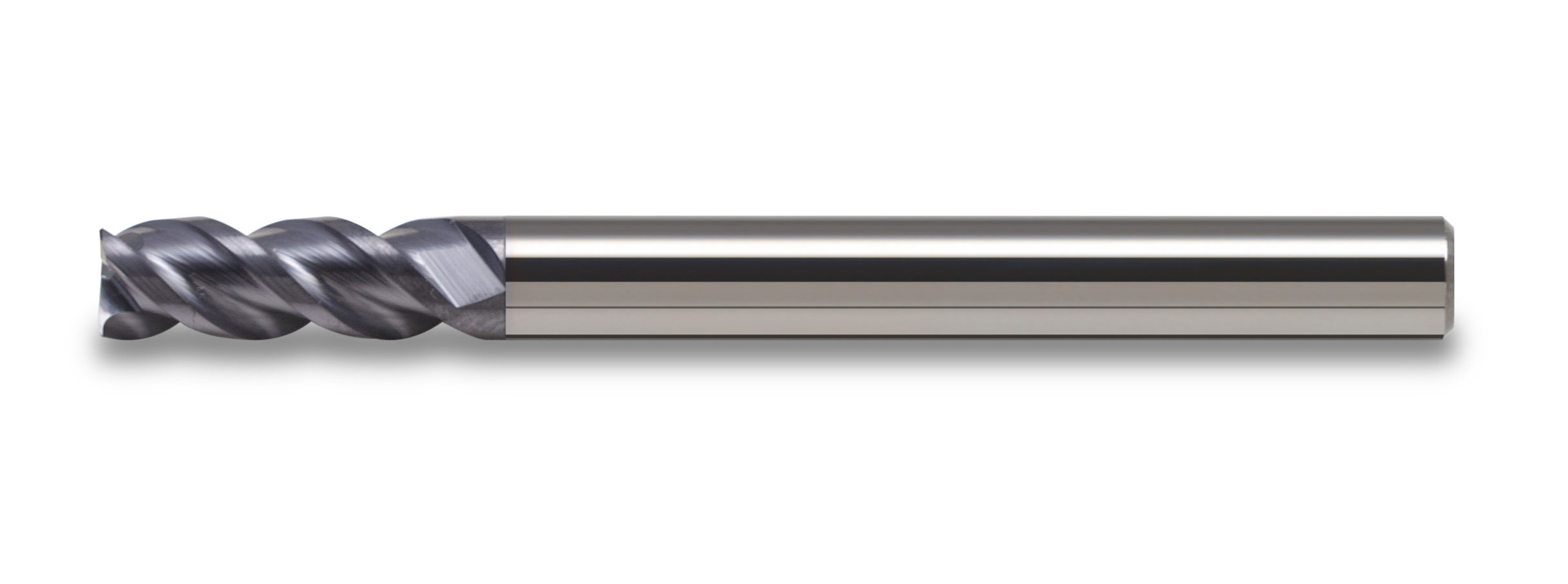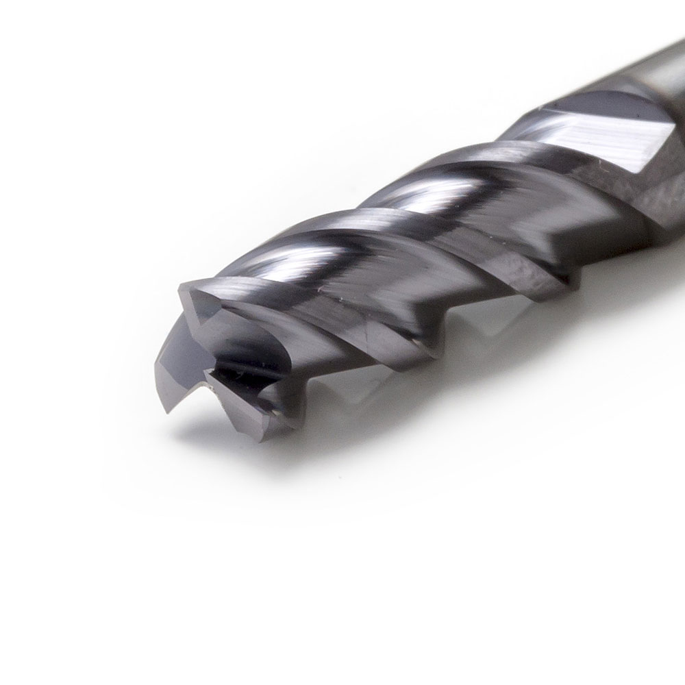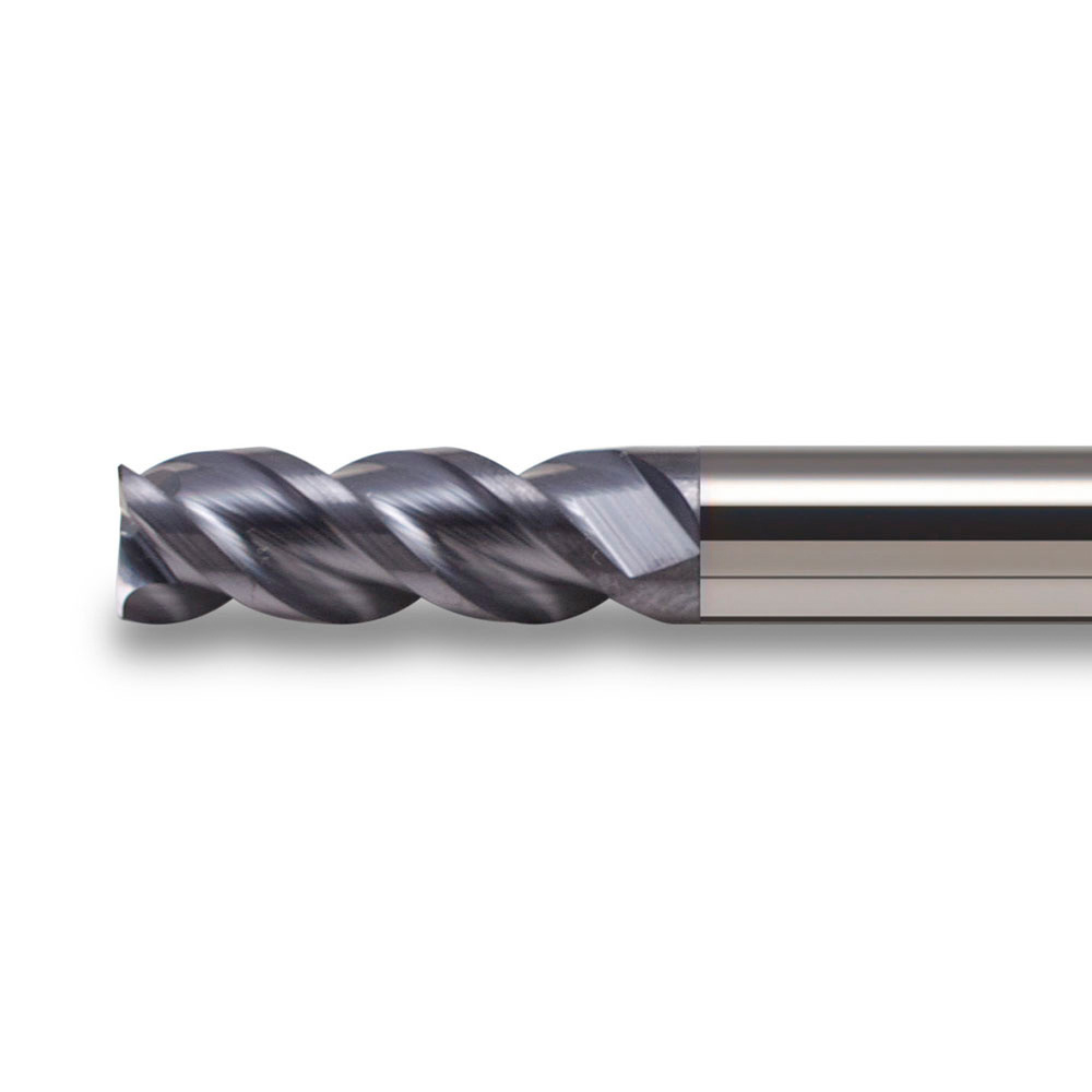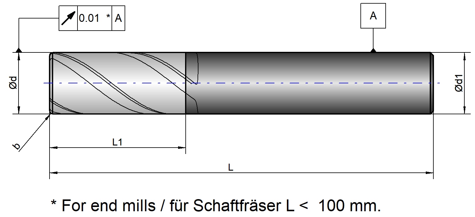 VHM gecoate 3 snijder, 45° gespiraliseerd, met vrijgeslepen nek. Voor toepassing op met name stalen. Snijkanten 45° afgeschuind. Met vrijgeslepen nek en cilindrisch schacht.
