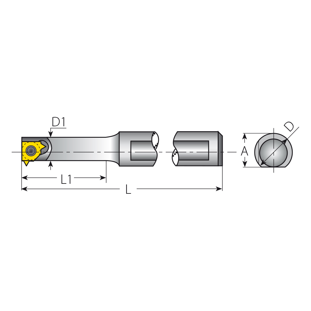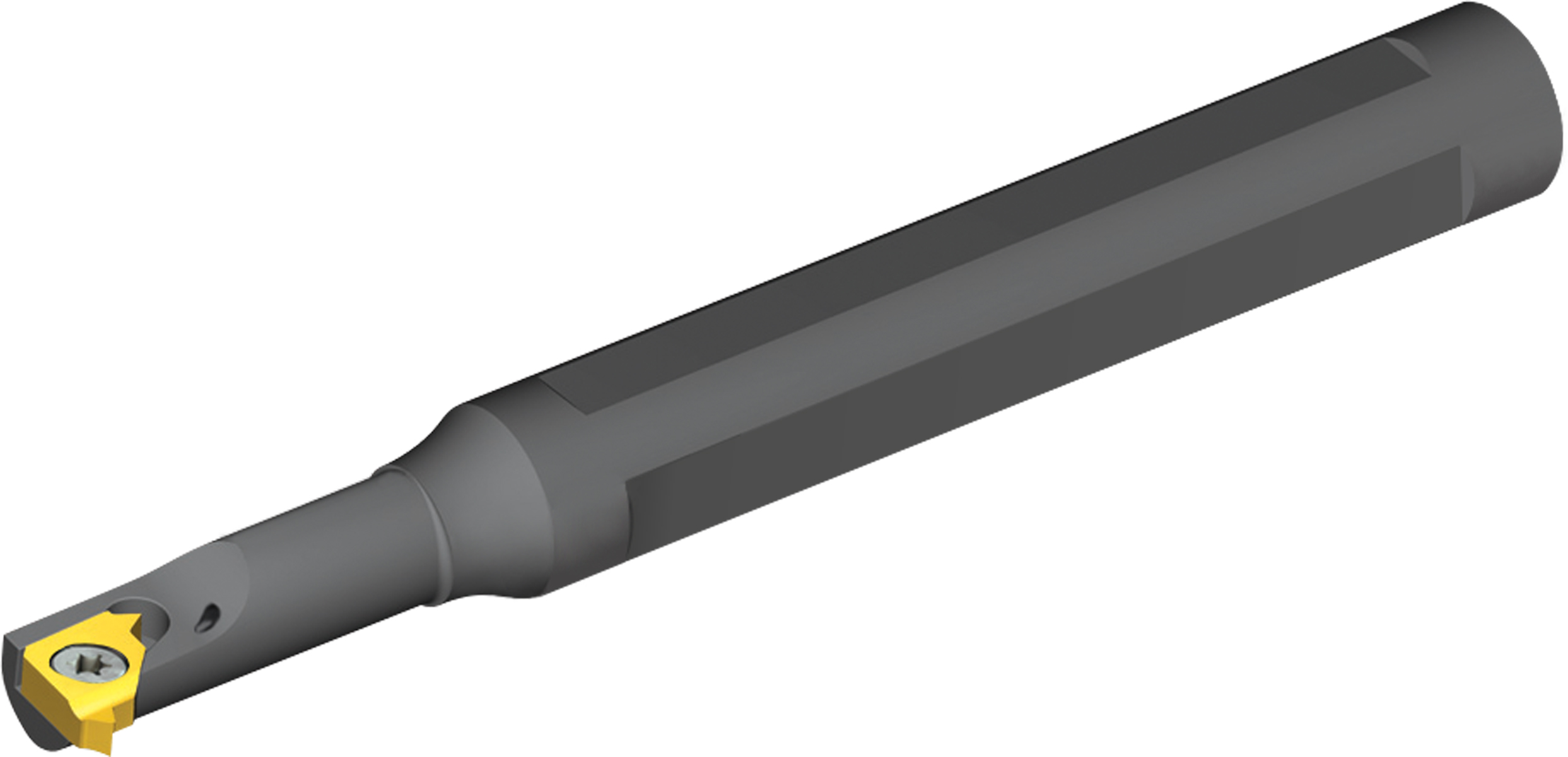 Mini-L draadsnijhouder met hardmetalen ronde schacht voor inwendige schroefdraad. Voor gestandaardiseerde draadsnijwisselplaten met 3 snijkanten.